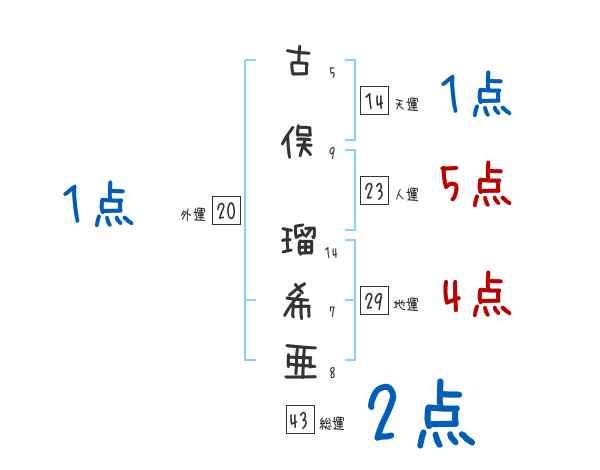 人運![]() | 古俣瑠希亜さんの人運は23画の5つ星!想像力に優れ活力がある。一代で成功し名誉を手に入れる。 性格や才能などを表す2番目に重要な運勢です。人間関係や協調性、社会的な成功に影響します。主に20歳から50歳ぐらいまでの中年期の運勢を表します。 |
