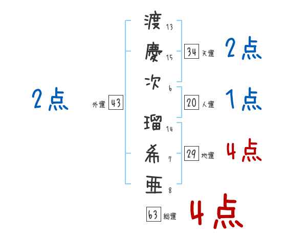 天運![]() | 渡慶次瑠希亜さんの天運は34画の2つ星!独創性に優れるが、自尊心が強く災難に注意しましょう。 家系が持つ宿命的な運勢を表します。祖先から受け継いだ苗字ですので自分の力が及びません。家柄を象徴します。 |