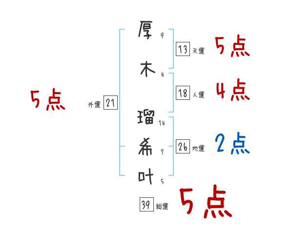 外運![]() | 厚木瑠希叶さんの外運は21画の5つ星!統率力がある。独立し成功する。名誉を手に入れる。 生活面を象徴する運勢です。外部から受ける影響力を表し、結婚運、家庭運や職場、環境への順応性を表します。 |