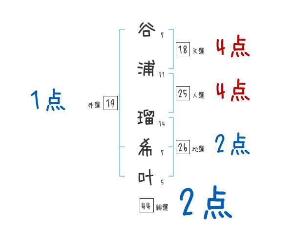 天運![]() | 谷浦瑠希叶さんの天運は18画の4つ星!情熱的で剛気。忍耐力があり信頼される。 家系が持つ宿命的な運勢を表します。祖先から受け継いだ苗字ですので自分の力が及びません。家柄を象徴します。 |