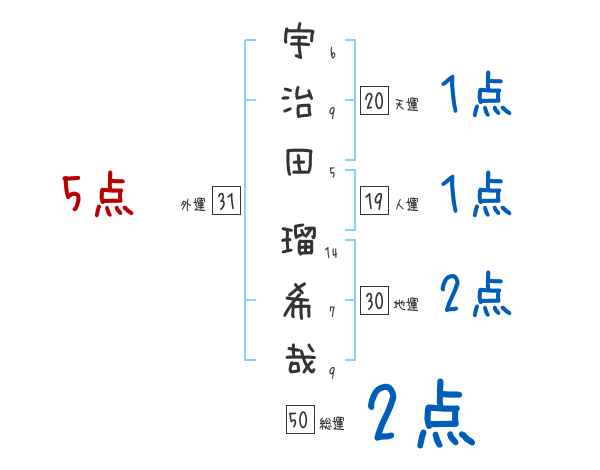 総運![]() | 宇治田瑠希哉さんの総運は50画の2つ星!浮き沈みが激しく不安定。しりすぼみに衰退しやすいので注意しましょう。 あなたの人生を表す1番重要な運勢です。生涯を通じて影響する総合運となり、主に50歳以降の晩年期に影響を及ぼします。 |
