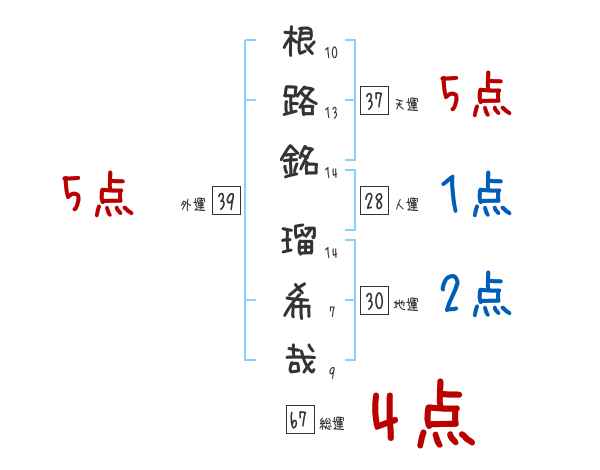 天運![]() | 根路銘瑠希哉さんの天運は37画の5つ星!努力家で順応性に優れる。現実的な考え方ができ忠実に物事をこなす。 家系が持つ宿命的な運勢を表します。祖先から受け継いだ苗字ですので自分の力が及びません。家柄を象徴します。 |