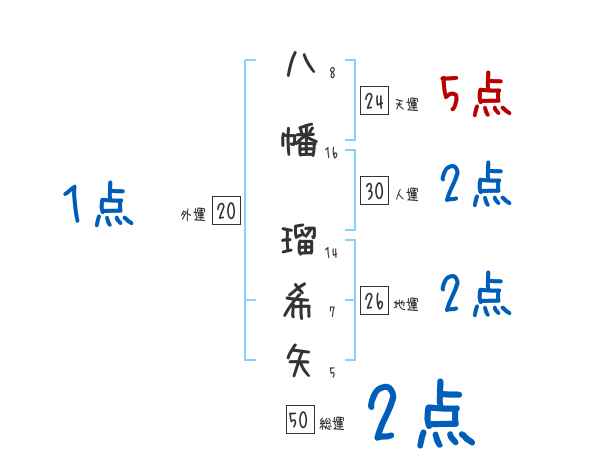 天運![]() | 八幡瑠希矢さんの天運は24画の5つ星!家庭運が良く順調な人生。金運にも恵まれる。 家系が持つ宿命的な運勢を表します。祖先から受け継いだ苗字ですので自分の力が及びません。家柄を象徴します。 |