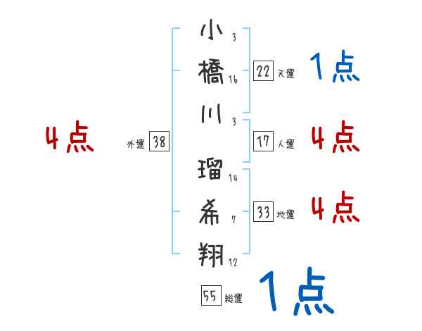 外運![]() | 小橋川瑠希翔さんの外運は38画の4つ星!温厚な性格で技術的な才能を発揮する。職人的な仕事に向いている。 生活面を象徴する運勢です。外部から受ける影響力を表し、結婚運、家庭運や職場、環境への順応性を表します。 |