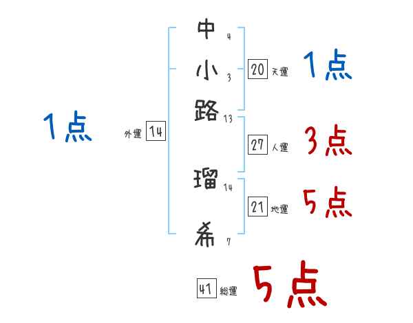 外運![]() | 中小路瑠希さんの外運は14画の1つ星!人に対して優しいがストレスを溜め込みがち。人間関係のトラブルを避けるよう気をつけましょう。 生活面を象徴する運勢です。外部から受ける影響力を表し、結婚運、家庭運や職場、環境への順応性を表します。 |