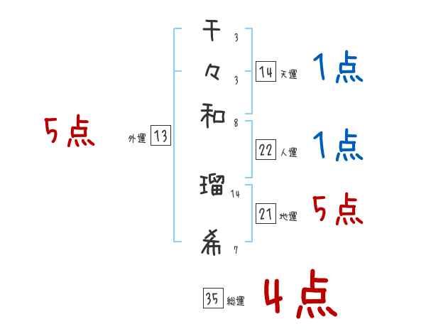 天運![]() | 千々和瑠希さんの天運は14画の1つ星!人に対して優しいがストレスを溜め込みがち。人間関係のトラブルを避けるよう気をつけましょう。 家系が持つ宿命的な運勢を表します。祖先から受け継いだ苗字ですので自分の力が及びません。家柄を象徴します。 |