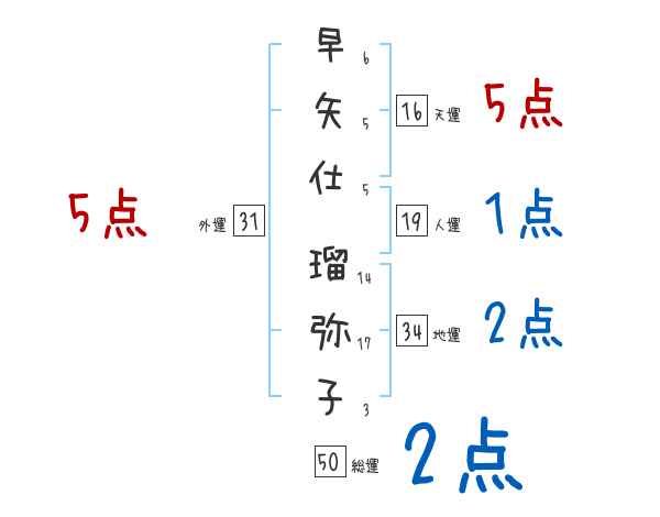 総運![]() | 早矢仕瑠弥子さんの総運は50画の2つ星!浮き沈みが激しく不安定。しりすぼみに衰退しやすいので注意しましょう。 あなたの人生を表す1番重要な運勢です。生涯を通じて影響する総合運となり、主に50歳以降の晩年期に影響を及ぼします。 |