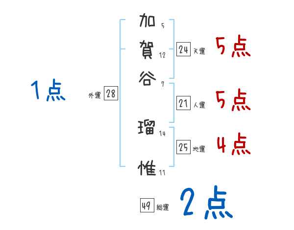 天運![]() | 加賀谷瑠惟さんの天運は24画の5つ星!家庭運が良く順調な人生。金運にも恵まれる。 家系が持つ宿命的な運勢を表します。祖先から受け継いだ苗字ですので自分の力が及びません。家柄を象徴します。 |