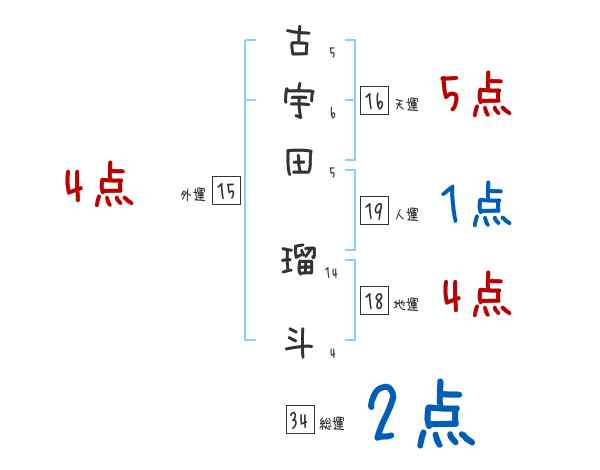 天運![]() | 古宇田瑠斗さんの天運は16画の5つ星!人望が厚く大きく発展する。逆転成功が見える。 家系が持つ宿命的な運勢を表します。祖先から受け継いだ苗字ですので自分の力が及びません。家柄を象徴します。 |