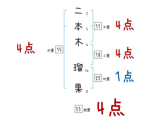 天運![]() | 二本木瑠果さんの天運は11画の4つ星!着実に富や地位を得る幸運な人生。 家系が持つ宿命的な運勢を表します。祖先から受け継いだ苗字ですので自分の力が及びません。家柄を象徴します。 |