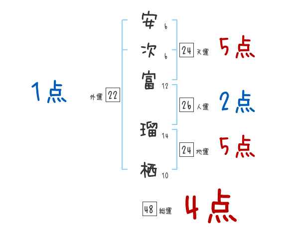 天運![]() | 安次富瑠栖さんの天運は24画の5つ星!家庭運が良く順調な人生。金運にも恵まれる。 家系が持つ宿命的な運勢を表します。祖先から受け継いだ苗字ですので自分の力が及びません。家柄を象徴します。 |