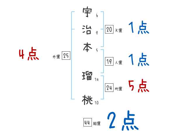 総運![]() | 宇治本瑠桃さんの総運は44画の2つ星!誠実で慎重な性格。物事を考えすぎないように注意しましょう。 あなたの人生を表す1番重要な運勢です。生涯を通じて影響する総合運となり、主に50歳以降の晩年期に影響を及ぼします。 |