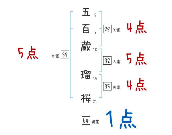 外運![]() | 五百蔵瑠桜さんの外運は32画の5つ星!柔軟性があり成功する。チャンスが多く金運が良い。 生活面を象徴する運勢です。外部から受ける影響力を表し、結婚運、家庭運や職場、環境への順応性を表します。 |