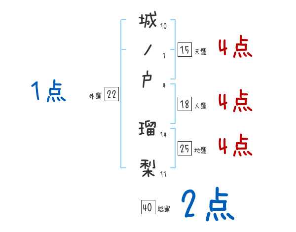 外運![]() | 城ノ戸瑠梨さんの外運は22画の1つ星!努力することが苦手ないっぽう手先が器用。芸術性にも優れる。 生活面を象徴する運勢です。外部から受ける影響力を表し、結婚運、家庭運や職場、環境への順応性を表します。 |