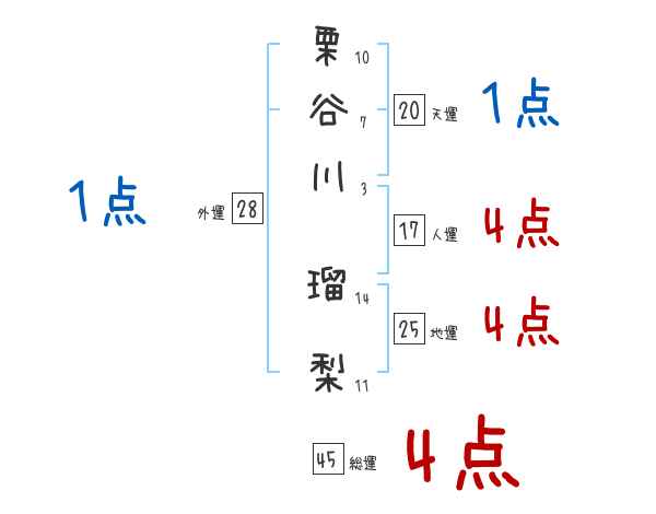 総運![]() | 栗谷川瑠梨さんの総運は45画の4つ星!もくもくと物事を進め達成する。地味な努力家。 あなたの人生を表す1番重要な運勢です。生涯を通じて影響する総合運となり、主に50歳以降の晩年期に影響を及ぼします。 |