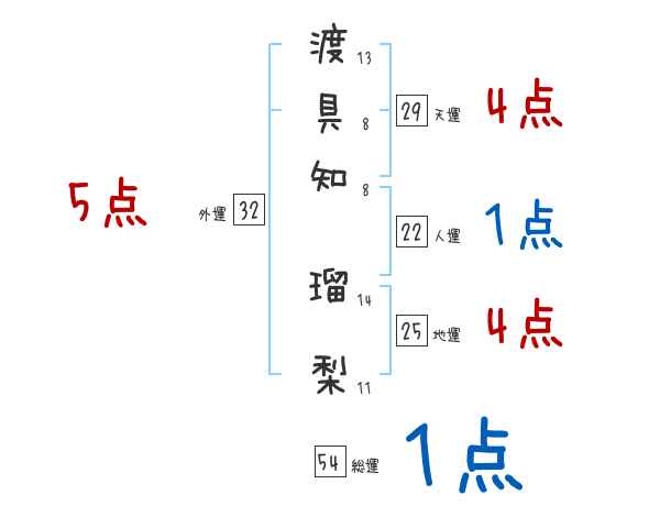 外運![]() | 渡具知瑠梨さんの外運は32画の5つ星!柔軟性があり成功する。チャンスが多く金運が良い。 生活面を象徴する運勢です。外部から受ける影響力を表し、結婚運、家庭運や職場、環境への順応性を表します。 |