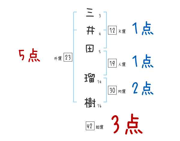 外運![]() | 三井田瑠樹さんの外運は23画の5つ星!想像力に優れ活力がある。一代で成功し名誉を手に入れる。 生活面を象徴する運勢です。外部から受ける影響力を表し、結婚運、家庭運や職場、環境への順応性を表します。 |