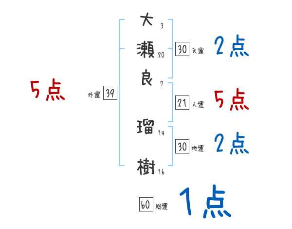 天運![]() | 大瀬良瑠樹さんの天運は30画の2つ星!浮き沈みの激しさに注意しましょう。 家系が持つ宿命的な運勢を表します。祖先から受け継いだ苗字ですので自分の力が及びません。家柄を象徴します。 |