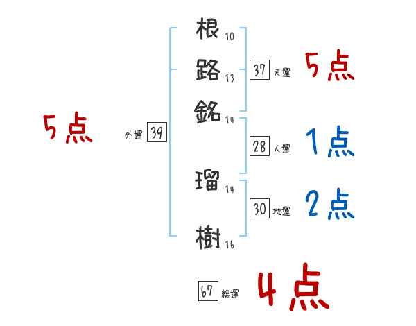 外運![]() | 根路銘瑠樹さんの外運は39画の5つ星!社交性に優れ人望が厚い。人の上に立ち成功する。 生活面を象徴する運勢です。外部から受ける影響力を表し、結婚運、家庭運や職場、環境への順応性を表します。 |