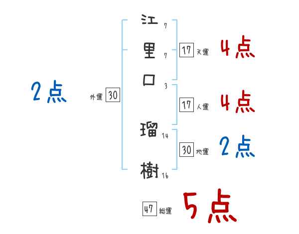 総運![]() | 江里口瑠樹さんの総運は47画の5つ星!実力が開花し発展する円満な人生。財に恵まれる。 あなたの人生を表す1番重要な運勢です。生涯を通じて影響する総合運となり、主に50歳以降の晩年期に影響を及ぼします。 |