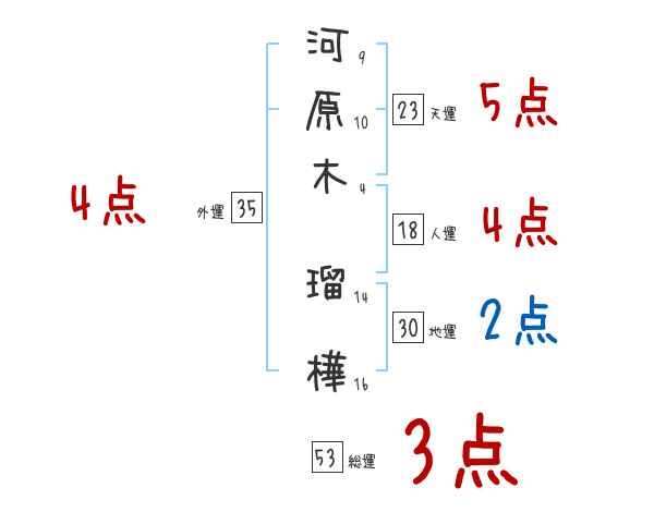 外運![]() | 河原木瑠樺さんの外運は35画の4つ星!温厚な性格で感受性が高い。穏和な性格で人望が厚い。 生活面を象徴する運勢です。外部から受ける影響力を表し、結婚運、家庭運や職場、環境への順応性を表します。 |