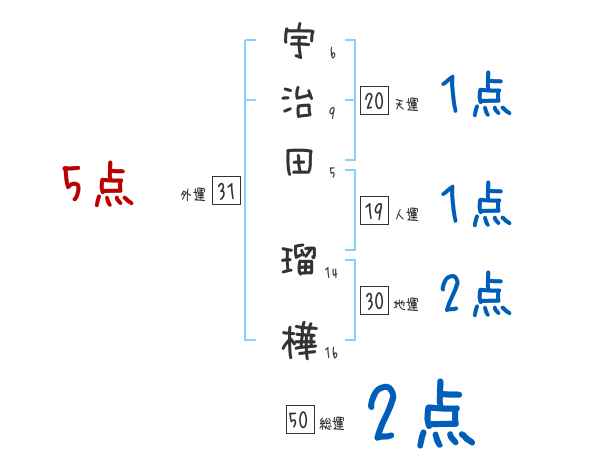 総運![]() | 宇治田瑠樺さんの総運は50画の2つ星!浮き沈みが激しく不安定。しりすぼみに衰退しやすいので注意しましょう。 あなたの人生を表す1番重要な運勢です。生涯を通じて影響する総合運となり、主に50歳以降の晩年期に影響を及ぼします。 |