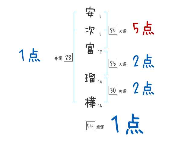 天運![]() | 安次富瑠樺さんの天運は24画の5つ星!家庭運が良く順調な人生。金運にも恵まれる。 家系が持つ宿命的な運勢を表します。祖先から受け継いだ苗字ですので自分の力が及びません。家柄を象徴します。 |
