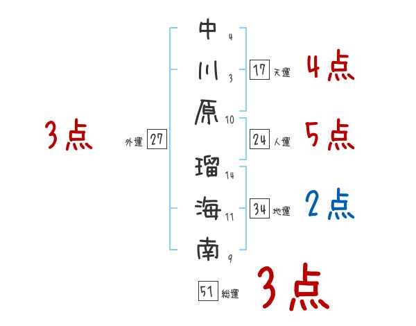 外運![]() | 中川原瑠海南さんの外運は27画の3つ星!頭脳明晰だが強情で摩擦が多い傾向。孤立に注意。 生活面を象徴する運勢です。外部から受ける影響力を表し、結婚運、家庭運や職場、環境への順応性を表します。 |
