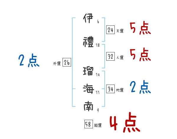 外運![]() | 伊禮瑠海南さんの外運は26画の2つ星!波瀾万丈かも。信頼できる人を大事にしましょう。 生活面を象徴する運勢です。外部から受ける影響力を表し、結婚運、家庭運や職場、環境への順応性を表します。 |