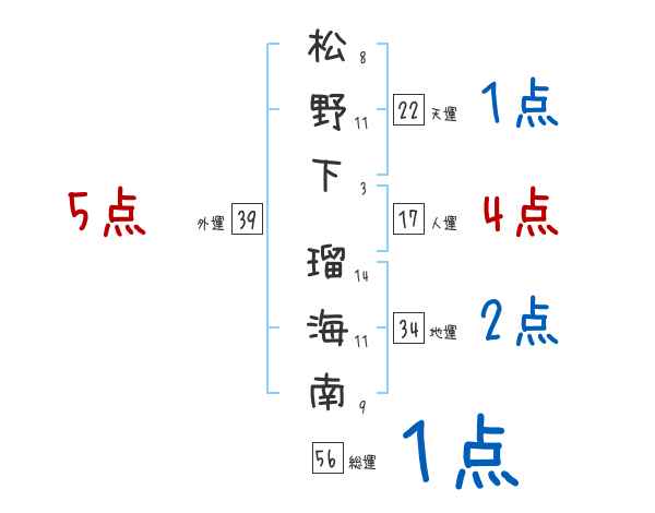 外運![]() | 松野下瑠海南さんの外運は39画の5つ星!社交性に優れ人望が厚い。人の上に立ち成功する。 生活面を象徴する運勢です。外部から受ける影響力を表し、結婚運、家庭運や職場、環境への順応性を表します。 |