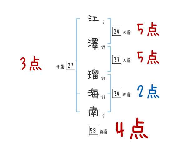 天運![]() | 江澤瑠海南さんの天運は24画の5つ星!家庭運が良く順調な人生。金運にも恵まれる。 家系が持つ宿命的な運勢を表します。祖先から受け継いだ苗字ですので自分の力が及びません。家柄を象徴します。 |