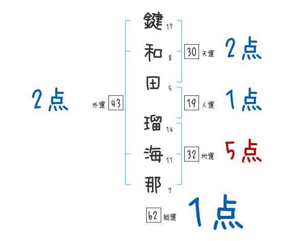 地運![]() | 鍵和田瑠海那さんの地運は32画の5つ星!柔軟性があり成功する。チャンスが多く金運が良い。 個性を表す基礎的な運勢です。性格形成や対人関係、行動力など家庭環境に影響されます。主に誕生してから20歳くらいまでの若年期の運勢を表します。 |