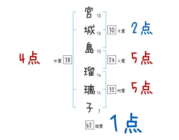 人運![]() | 宮城島瑠璃子さんの人運は24画の5つ星!家庭運が良く順調な人生。金運にも恵まれる。 性格や才能などを表す2番目に重要な運勢です。人間関係や協調性、社会的な成功に影響します。主に20歳から50歳ぐらいまでの中年期の運勢を表します。 |