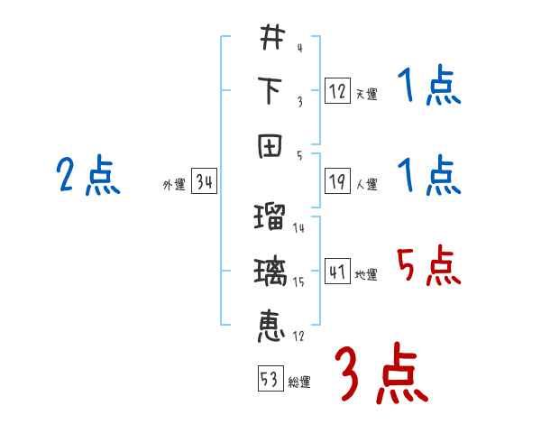 総運![]() | 井下田瑠璃恵さんの総運は53画の3つ星!やや見栄っ張りで虚栄心がある。散財に注意。 あなたの人生を表す1番重要な運勢です。生涯を通じて影響する総合運となり、主に50歳以降の晩年期に影響を及ぼします。 |