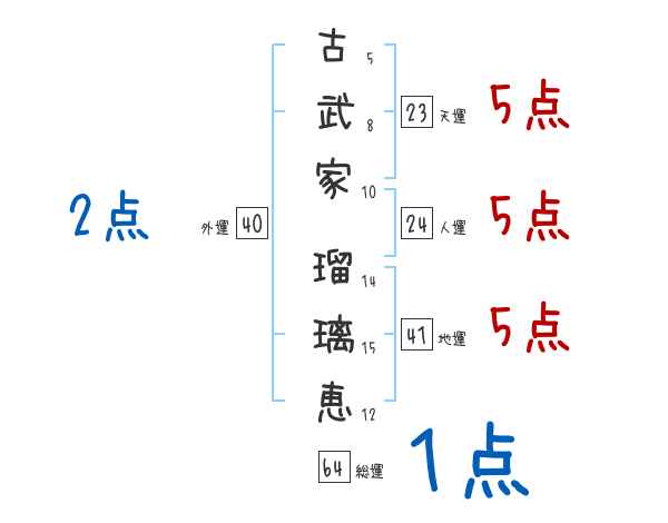 天運![]() | 古武家瑠璃恵さんの天運は23画の5つ星!想像力に優れ活力がある。一代で成功し名誉を手に入れる。 家系が持つ宿命的な運勢を表します。祖先から受け継いだ苗字ですので自分の力が及びません。家柄を象徴します。 |