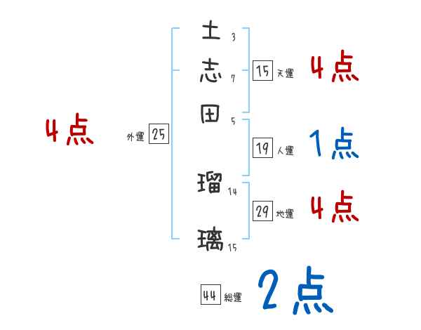 総運![]() | 土志田瑠璃さんの総運は44画の2つ星!誠実で慎重な性格。物事を考えすぎないように注意しましょう。 あなたの人生を表す1番重要な運勢です。生涯を通じて影響する総合運となり、主に50歳以降の晩年期に影響を及ぼします。 |