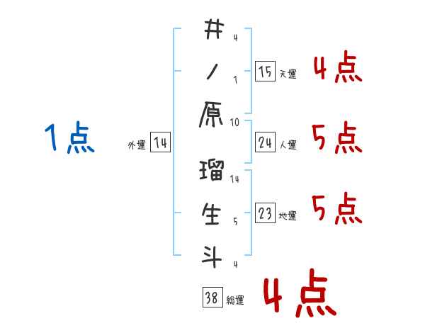 外運![]() | 井ノ原瑠生斗さんの外運は14画の1つ星!人に対して優しいがストレスを溜め込みがち。人間関係のトラブルを避けるよう気をつけましょう。 生活面を象徴する運勢です。外部から受ける影響力を表し、結婚運、家庭運や職場、環境への順応性を表します。 |