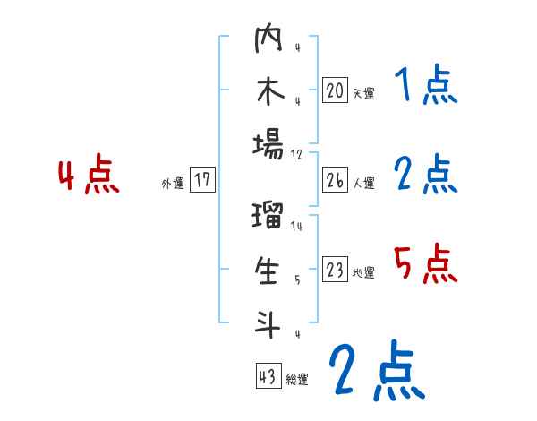 外運![]() | 内木場瑠生斗さんの外運は17画の4つ星!積極的な行動力。地位を気づき財産を手に入れる。純粋な心と直感力。 生活面を象徴する運勢です。外部から受ける影響力を表し、結婚運、家庭運や職場、環境への順応性を表します。 |