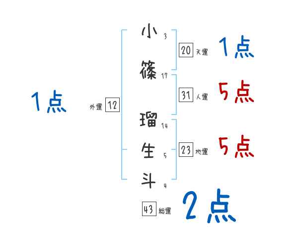 総運![]() | 小篠瑠生斗さんの総運は43画の2つ星!頑固な性格で独立心が強いかも。やや非現実的で浪費に注意しましょう。 あなたの人生を表す1番重要な運勢です。生涯を通じて影響する総合運となり、主に50歳以降の晩年期に影響を及ぼします。 |