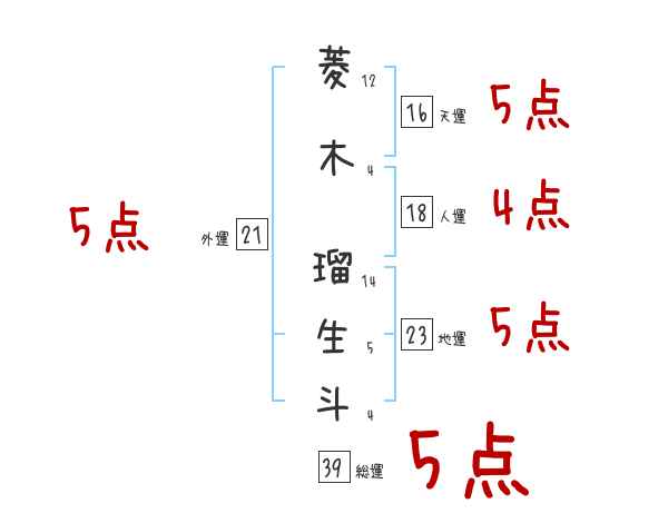 総運![]() | 菱木瑠生斗さんの総運は39画の5つ星!社交性に優れ人望が厚い。人の上に立ち成功する。 あなたの人生を表す1番重要な運勢です。生涯を通じて影響する総合運となり、主に50歳以降の晩年期に影響を及ぼします。 |