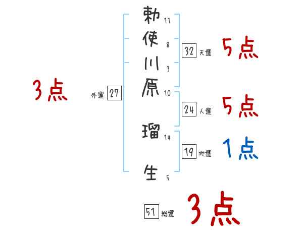 天運![]() | 勅使川原瑠生さんの天運は32画の5つ星!柔軟性があり成功する。チャンスが多く金運が良い。 家系が持つ宿命的な運勢を表します。祖先から受け継いだ苗字ですので自分の力が及びません。家柄を象徴します。 |