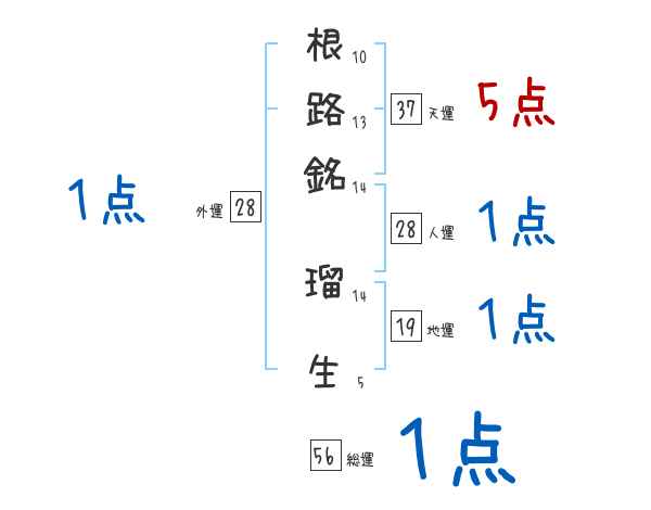 人運![]() | 根路銘瑠生さんの人運は28画の1つ星!家庭環境に注意。スポーツで活躍できる能力があるかも。 性格や才能などを表す2番目に重要な運勢です。人間関係や協調性、社会的な成功に影響します。主に20歳から50歳ぐらいまでの中年期の運勢を表します。 |