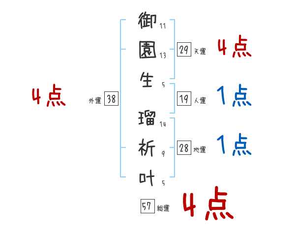 天運![]() | 御園生瑠祈叶さんの天運は29画の4つ星!完全主義で才能がある。厳格な心の持ち主。 家系が持つ宿命的な運勢を表します。祖先から受け継いだ苗字ですので自分の力が及びません。家柄を象徴します。 |
