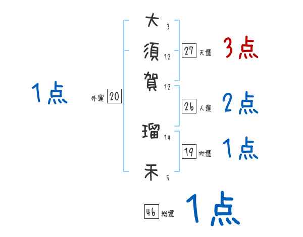天運![]() | 大須賀瑠禾さんの天運は27画の3つ星!頭脳明晰だが強情で摩擦が多い傾向。孤立に注意。 家系が持つ宿命的な運勢を表します。祖先から受け継いだ苗字ですので自分の力が及びません。家柄を象徴します。 |