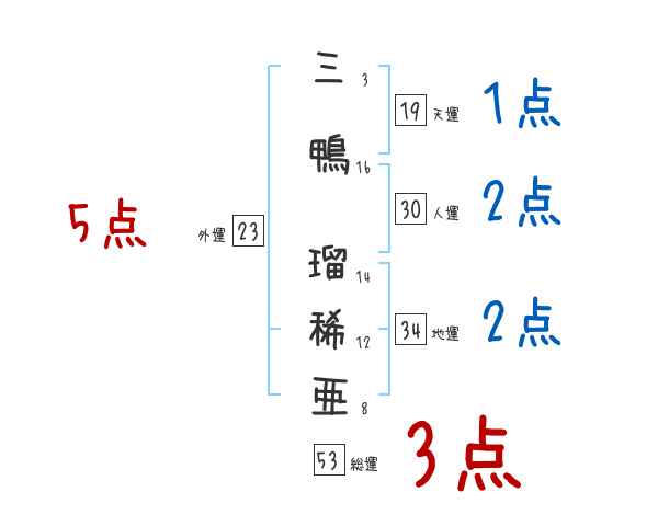 外運![]() | 三鴨瑠稀亜さんの外運は23画の5つ星!想像力に優れ活力がある。一代で成功し名誉を手に入れる。 生活面を象徴する運勢です。外部から受ける影響力を表し、結婚運、家庭運や職場、環境への順応性を表します。 |