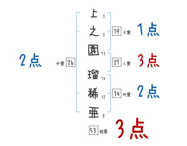 天運![]() | 上之園瑠稀亜さんの天運は19画の1つ星!優れた才能を持ちますが、協調性が足りないことも。周りの人と協力する事を意識しましょう。 家系が持つ宿命的な運勢を表します。祖先から受け継いだ苗字ですので自分の力が及びません。家柄を象徴します。 |