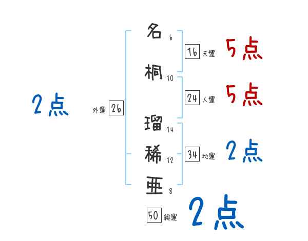 天運![]() | 名桐瑠稀亜さんの天運は16画の5つ星!人望が厚く大きく発展する。逆転成功が見える。 家系が持つ宿命的な運勢を表します。祖先から受け継いだ苗字ですので自分の力が及びません。家柄を象徴します。 |