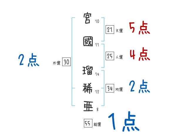 天運![]() | 宮國瑠稀亜さんの天運は21画の5つ星!統率力がある。独立し成功する。名誉を手に入れる。 家系が持つ宿命的な運勢を表します。祖先から受け継いだ苗字ですので自分の力が及びません。家柄を象徴します。 |