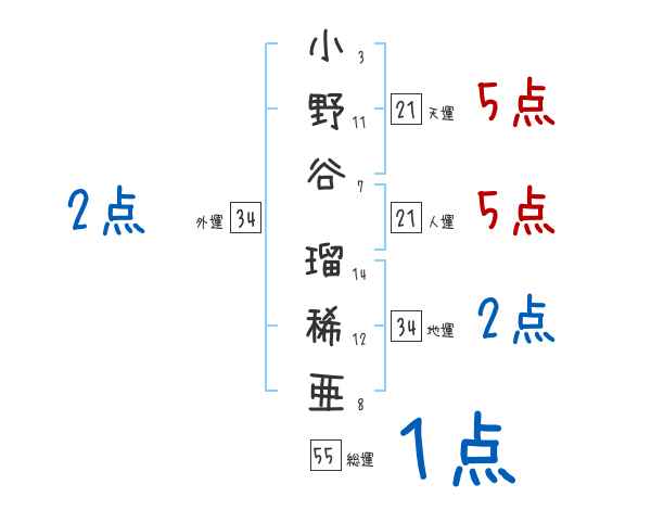天運![]() | 小野谷瑠稀亜さんの天運は21画の5つ星!統率力がある。独立し成功する。名誉を手に入れる。 家系が持つ宿命的な運勢を表します。祖先から受け継いだ苗字ですので自分の力が及びません。家柄を象徴します。 |