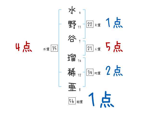 外運![]() | 水野谷瑠稀亜さんの外運は35画の4つ星!温厚な性格で感受性が高い。穏和な性格で人望が厚い。 生活面を象徴する運勢です。外部から受ける影響力を表し、結婚運、家庭運や職場、環境への順応性を表します。 |